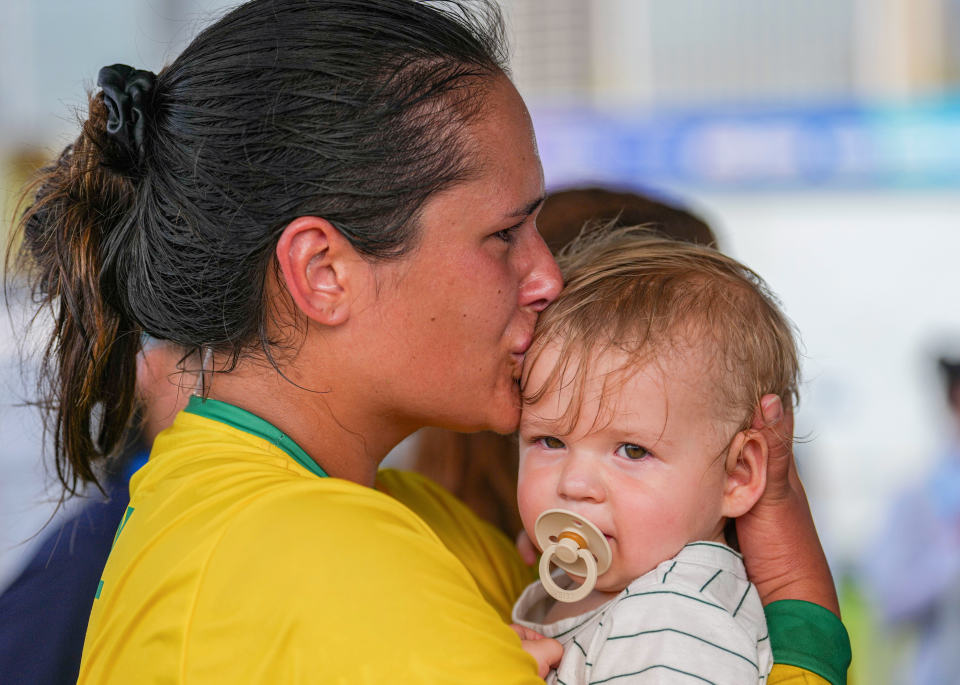 刚刚下场,27岁的巴西女队选手莎宾·萨弗特就迫不及待抱起一名11个月大的宝宝亲吻,这是她的小儿子。这位在场上威风八面的主力,瞬间变回温柔的母亲。